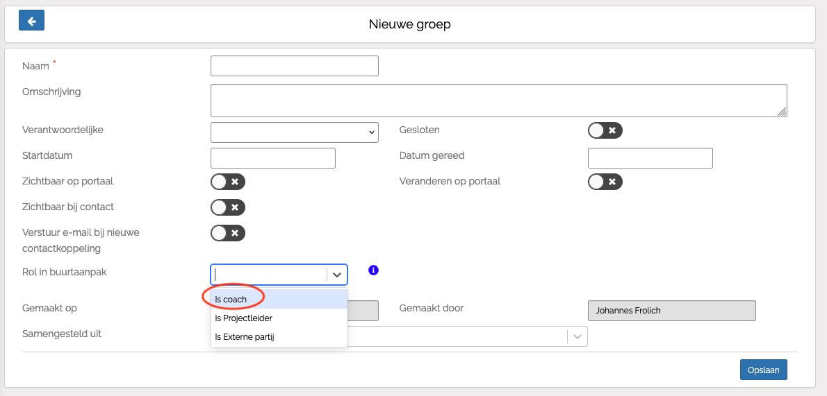 - Zet ‘Rol in buurtaanpak’ op ‘Is coach groep’
