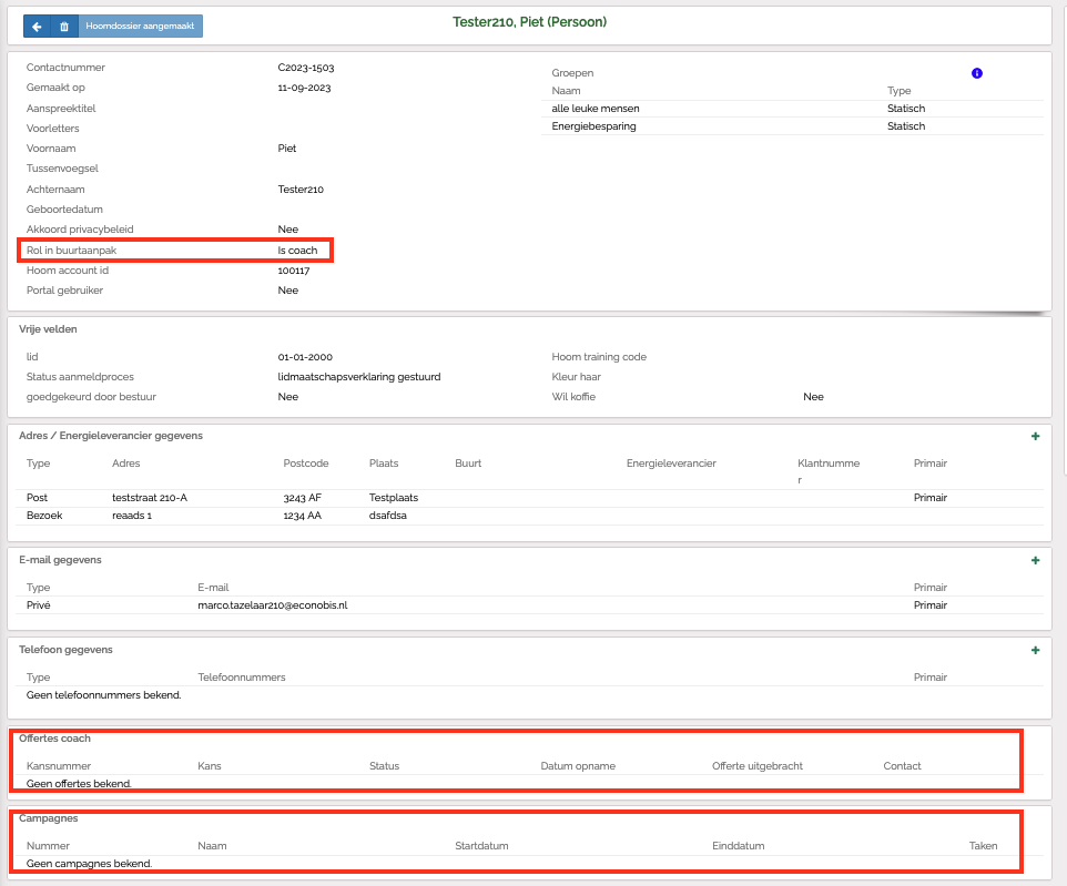 - ‘Rol in buurtaanpak’ staat op ‘Is coach groep’ > dan wordt bij leden van deze groep ook bij hun Contactgegevens getoond dat dit een coach is: ‘Rol in buurtaanpak’ staat op ‘Is coach’.