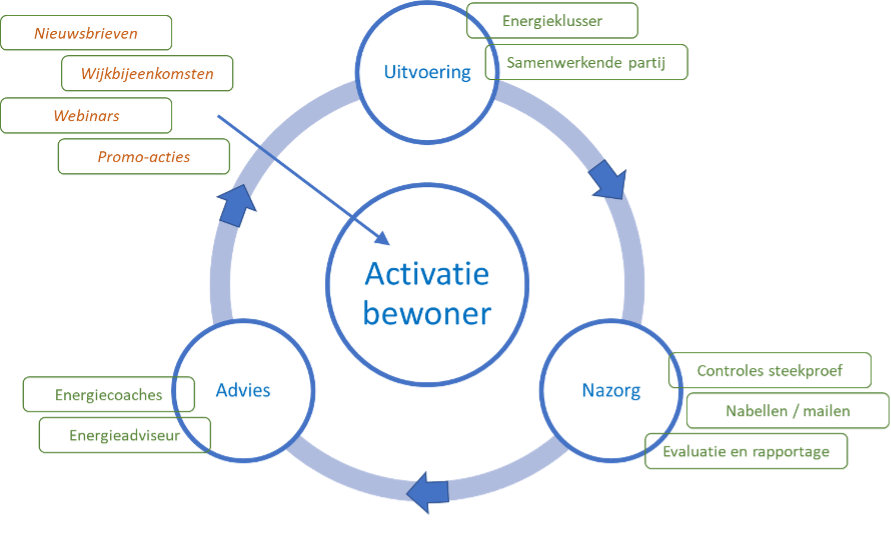 Tussen intake en kans of tussen kans en kansactie is vaak een contact met de bewoner gewenst. Door een medewerker/vrijwilliger van je initiatief, bv. een energiecoach.