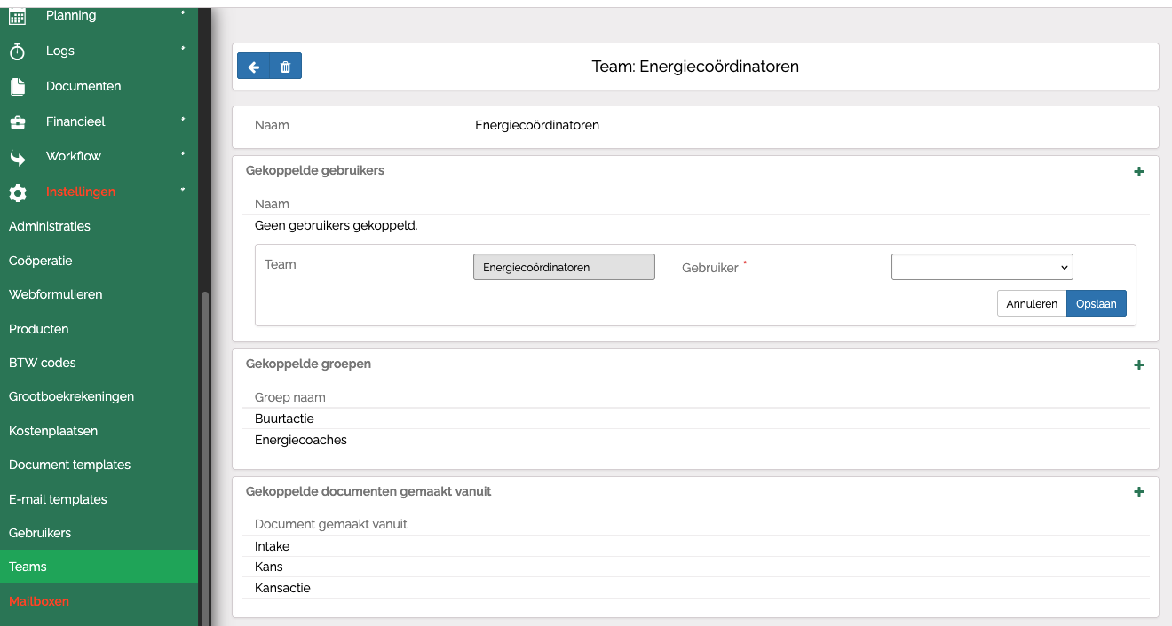 Stap 3: Koppel Documentgroepen aan het Team (optioneel). Door Documentgroepen aan het Team te koppelen kan je de zichtbare documenten voor de leden van het Team beperken. In bovenstaand voorbeeld zien de leden van de groep alleen documenten die betrekking hebben op Intakes, Kansen en Kansacties. Documenten over deelnames zijn niet zichtbaar.