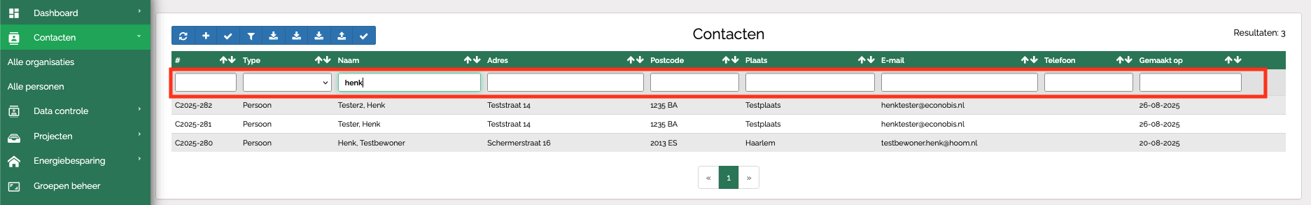 bv. plaats 'Nijmegen' of alleen alle contacten postcode beginnend met '6541'. Als je een van de filters invult.