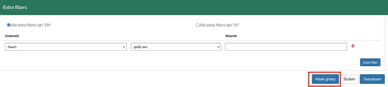 - Stel de gewenste filters in. Met de knop 'Maak groep' kun je een groep maken met de geselecteerde filters.
