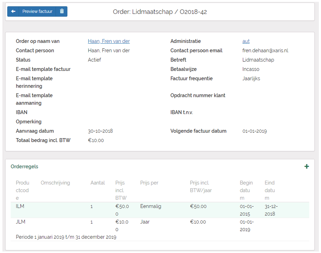 - Nieuwe orderregel toevoegen met JLM begindatum 01-01-2019