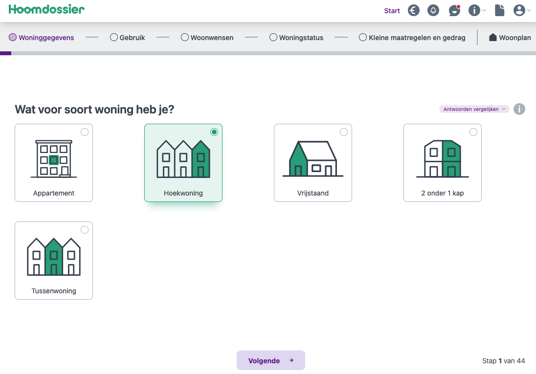 Om een vraag te beantwoorden selecteer je een antwoord en klikt op 'Volgende'. Jouw antwoord is dan opgeslagen, ook als je Hoomdossier afsluit en later weer verder gaat blijven de antwoorden bewaard.