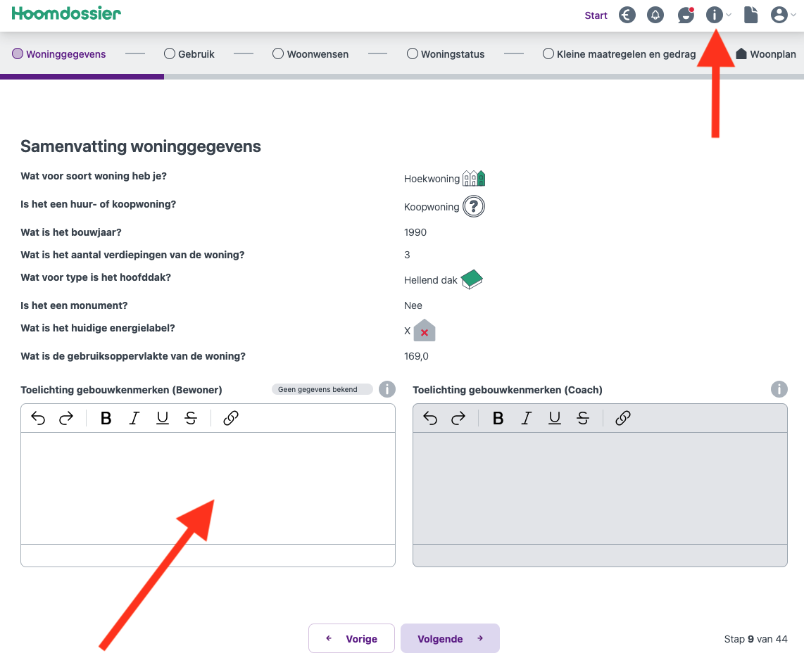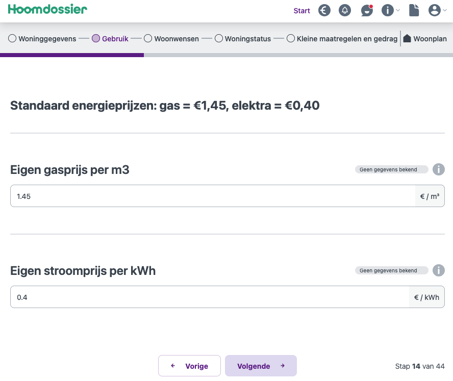 Als je jouw dossier voor het eerst invult krijg je vragen over jouw woning. Aan de hand van de basisgegevens worden er standaard gemiddelde waarden geselecteerd. Je kunt die waarden per vraag aanpassen als ze voor jouw woning afwijken.