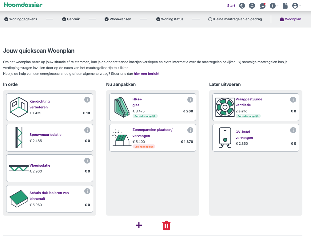 Je kunt de maatregelen van de ene naar de andere kolom slepen. Wil je een maatregel toch niet in jouw Woonplan opnemen, sleep 'm dan in de rode vuilnisbak onder de kolommen.